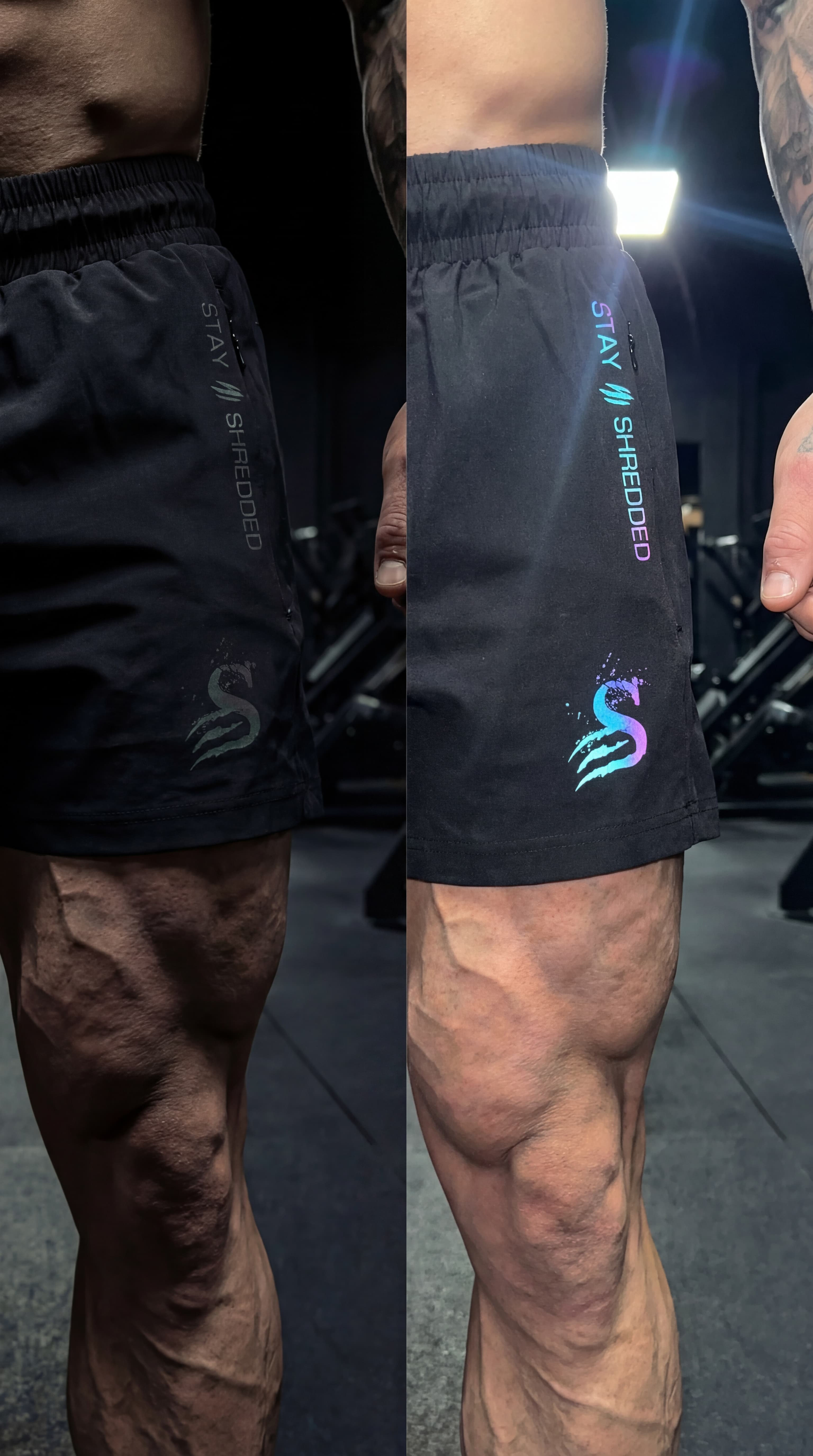 Our signature Stay Shredded logos appear grey in normal lighting but light up in luminous iridescent colours when hit with different angles of light. The colour-shifting reflective print on the S logo and Stay Shredded pocket logo creates an eye-catching glow effect that's perfect for gym videos, training content, and standing out during late-night sessions.